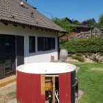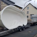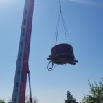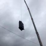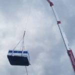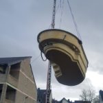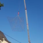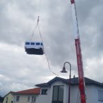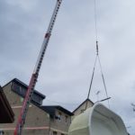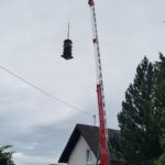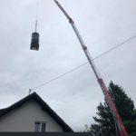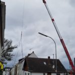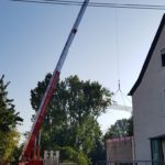 Das heben von Bauteilen einer Heizungsanlage über ein Haus.