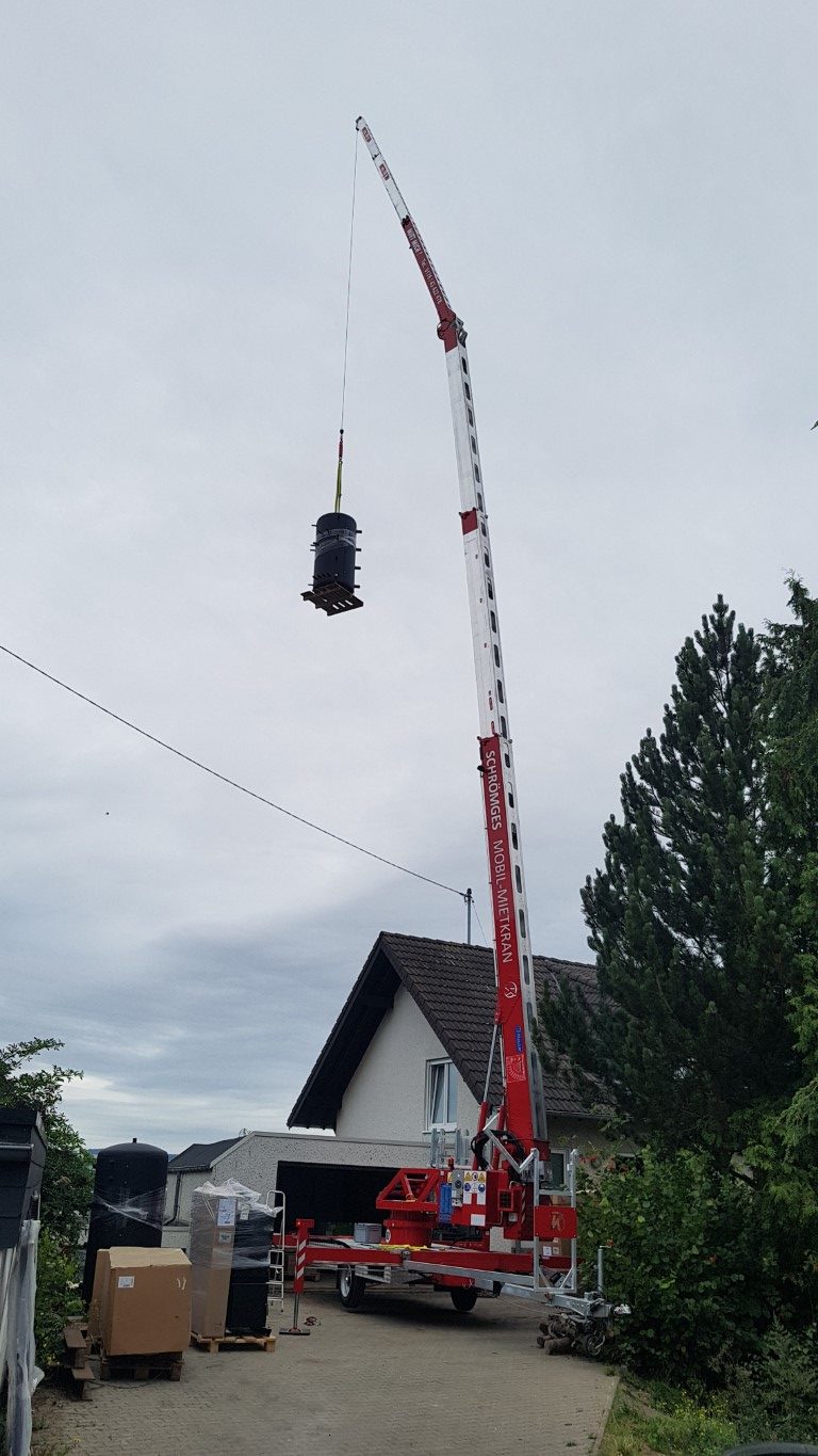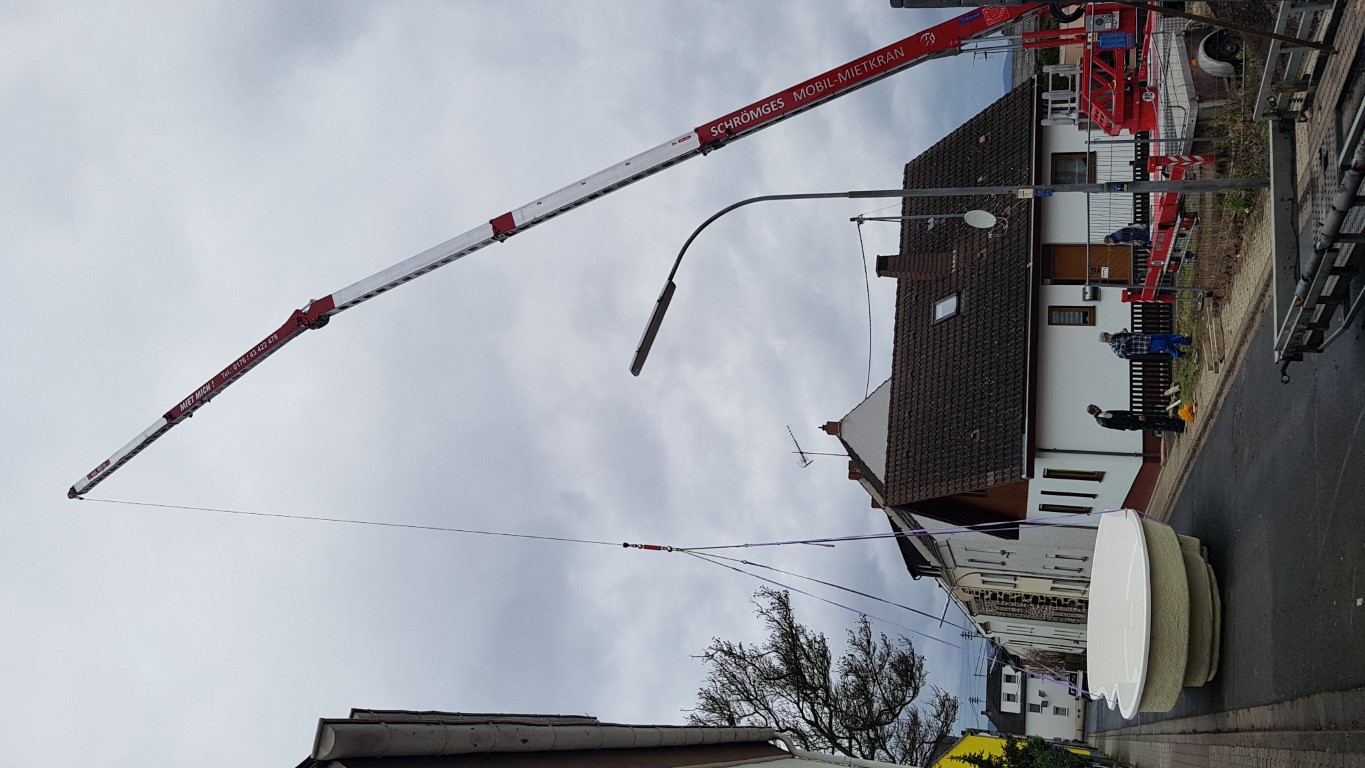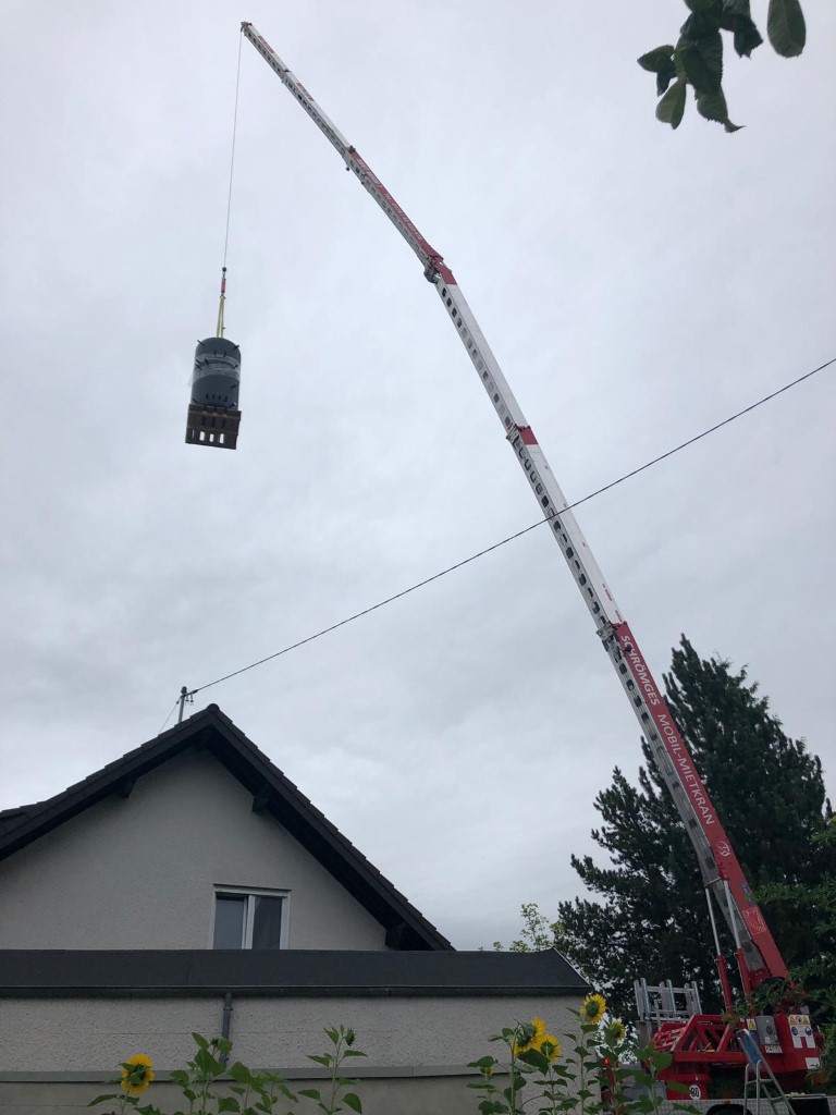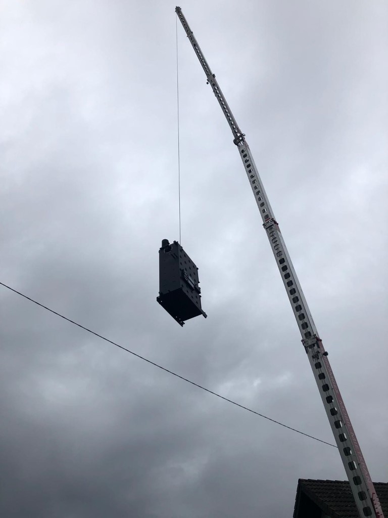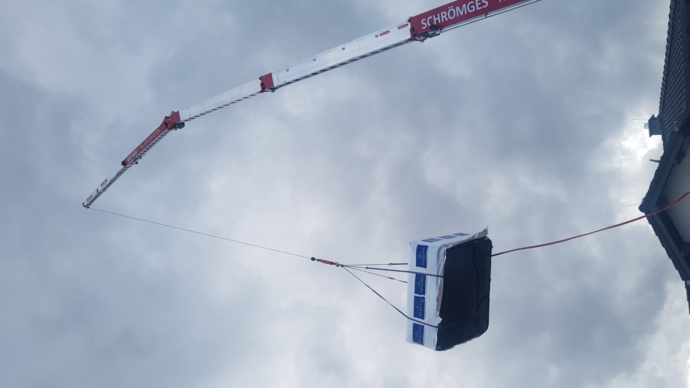 Das heben von Bauteilen einer Heizungsanlage über ein Haus.