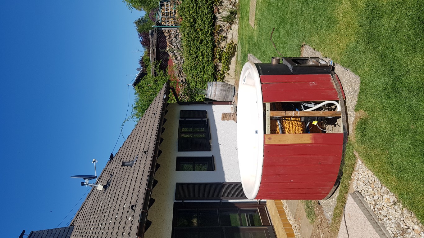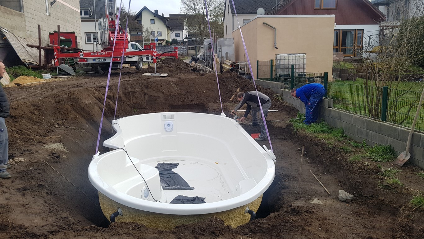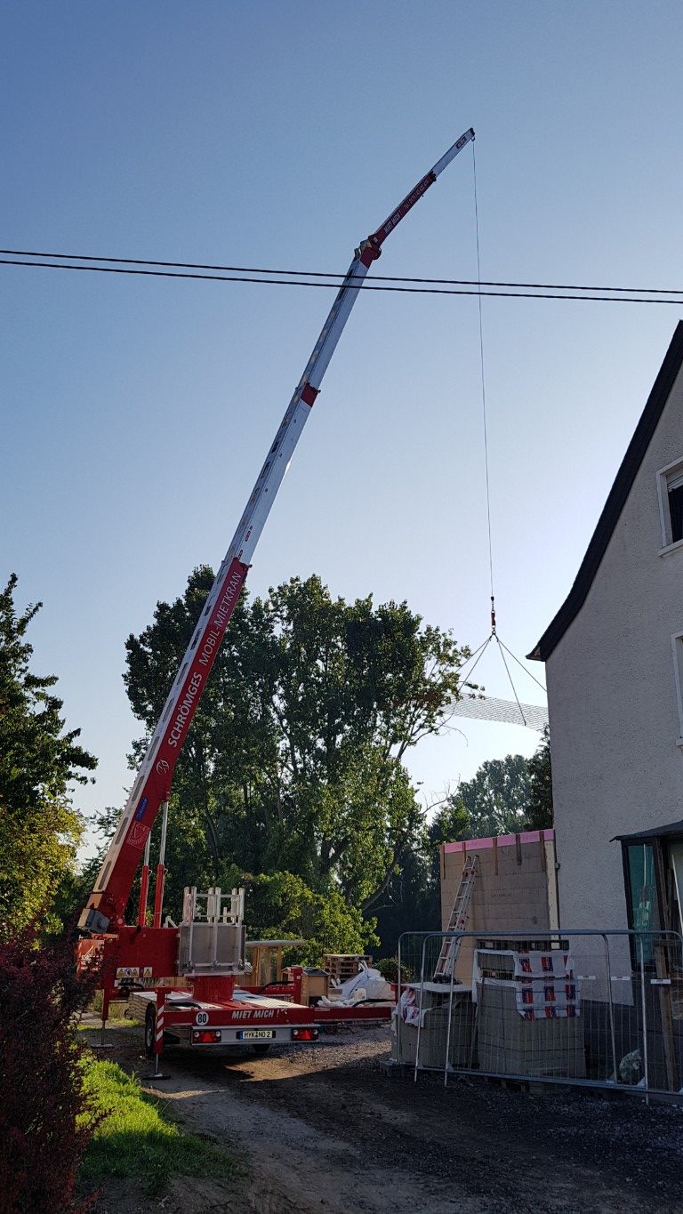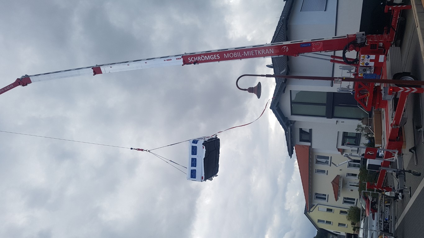 Das heben von Bauteilen einer Heizungsanlage über ein Haus.